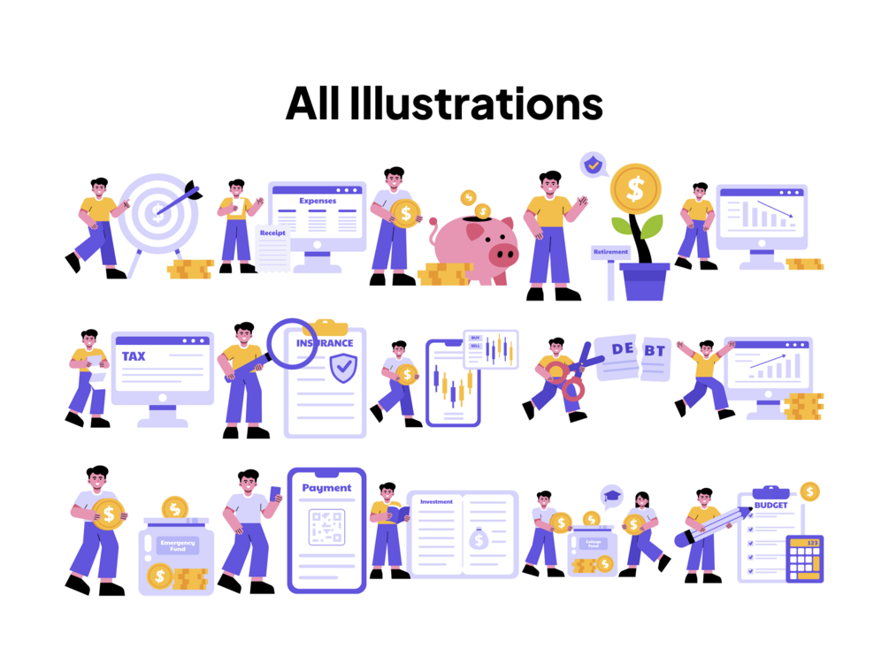 Introducing our Finance Illustration Set, featuring 15 meticulously crafted illustrations tailored for finance projects. Each illustration is available in AI, SVG, EPS, and PNG formats, ensuring compatibility and versatility. With high resolutions and full vector scalability, they maintain quality and sharpness. Organized for easy selection and integration, they streamline your workflow. Infused with a modern and unique style, these illustrations elevate your designs effortlessly. Explore our Finance Illustration Set for captivating financial visuals.