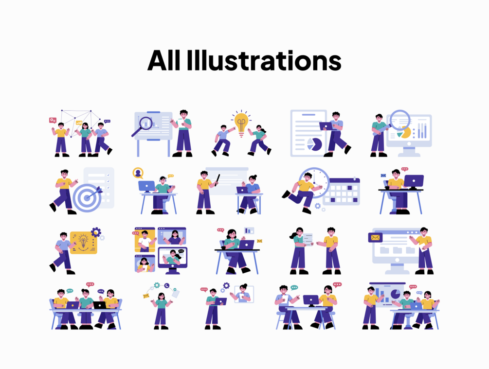 Introducing our Set of Working Activities Illustration, a comprehensive collection designed to bring life and clarity to your projects. With 20 dynamic illustrations depicting various work scenarios, this set is a versatile addition to any professional toolkit.